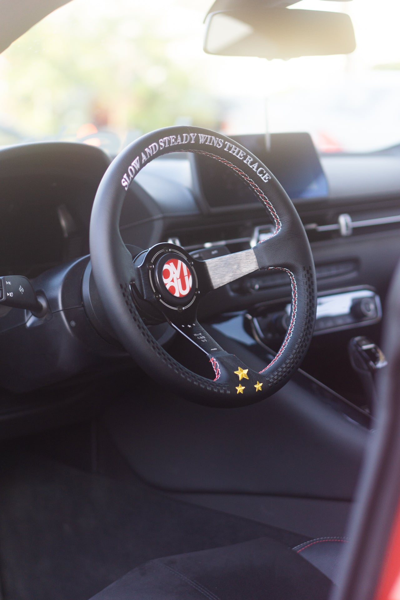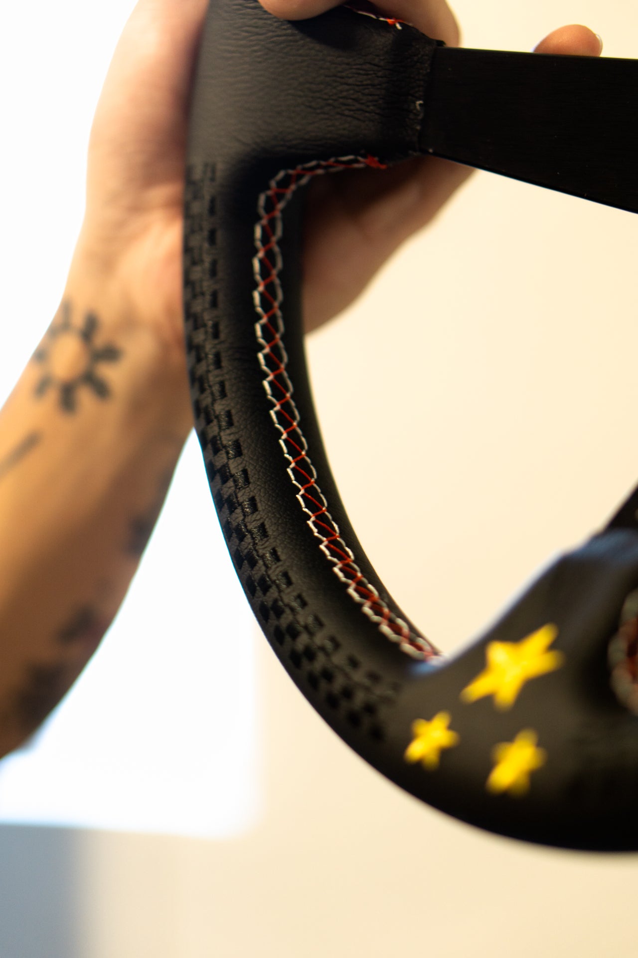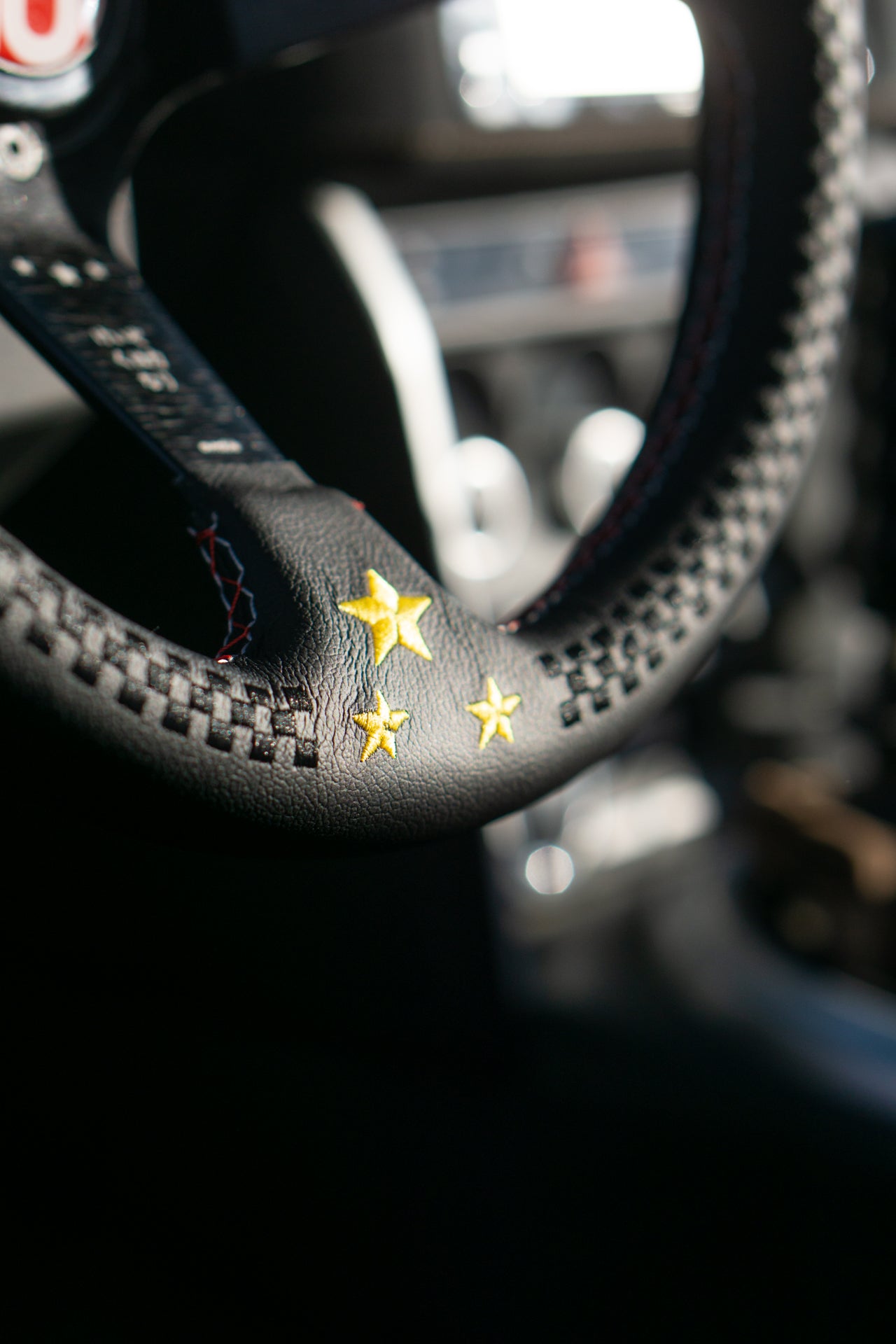 The wheel features subtle black checkered racing flag embroidery that adds a nice low-key look. You also won't need to worry about getting it dirty.